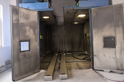 加工范圍:2套,每個(gè)移動(dòng)噴漆室有2個(gè)工作位置,每個(gè)工位的尺寸為12000X7000mm,兩個(gè)噴漆室可連在一起工作,即24000X7000mm